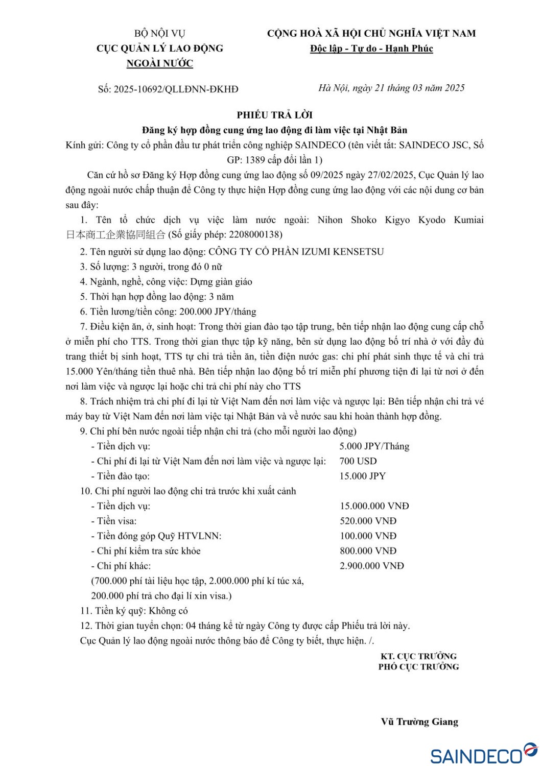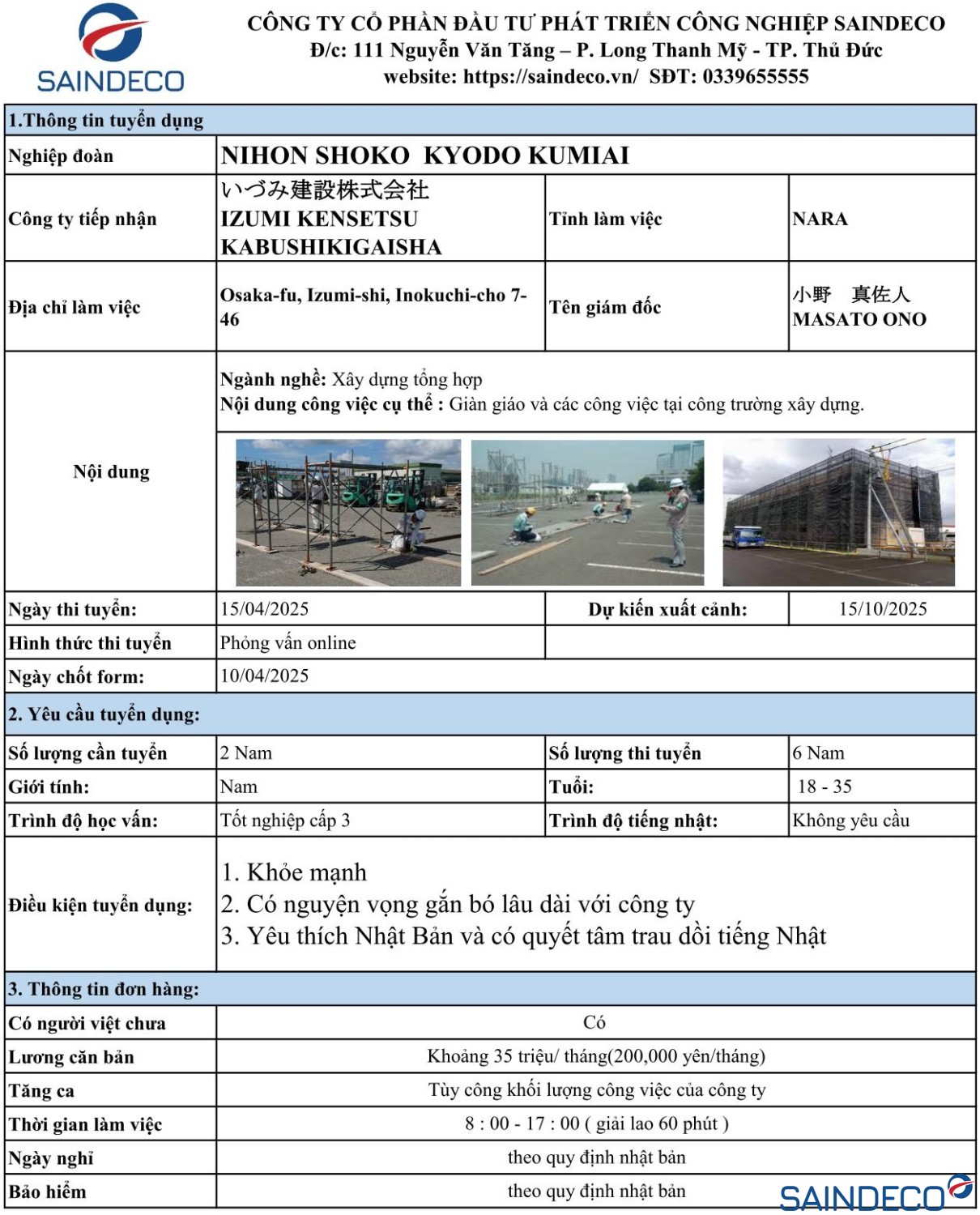 Ngày thi tuyển: 15/04/2025 Dự kiến xuất cảnh: 15/10/2025