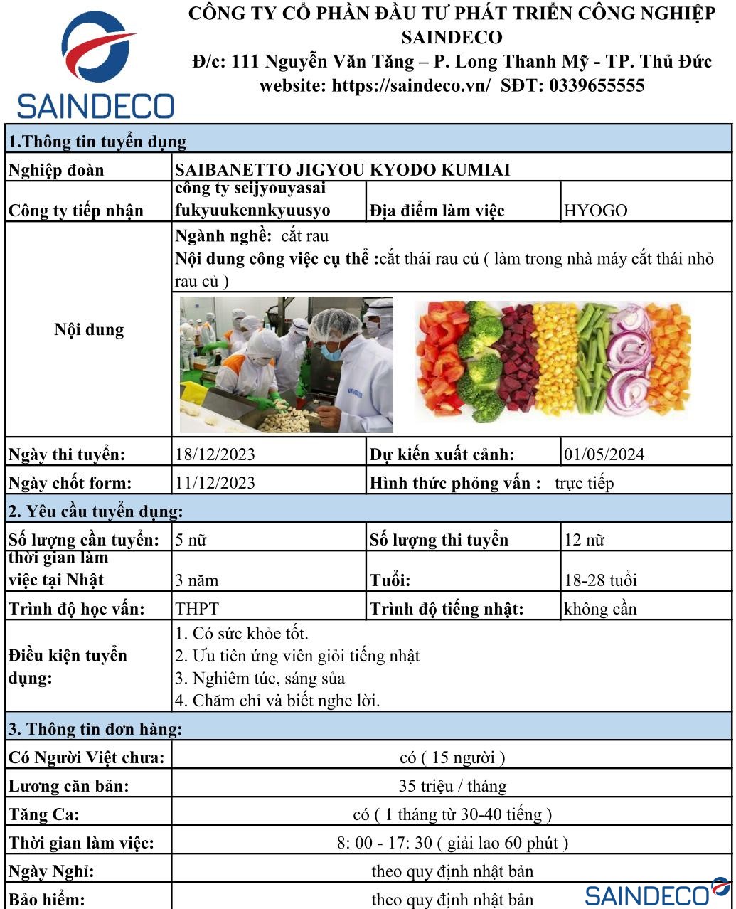 Nội dung công việc cụ thể :cắt thái rau củ ( làm trong nhà máy cắt thái nhỏ rau củ )