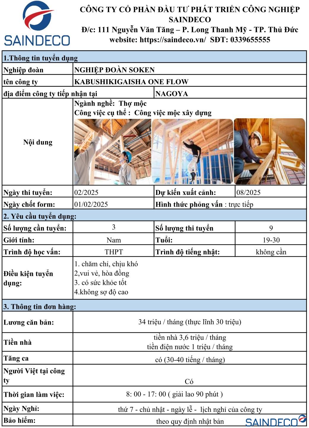 Ngày thi tuyển: 02/2025 Dự kiến xuất cảnh: 08/2025
