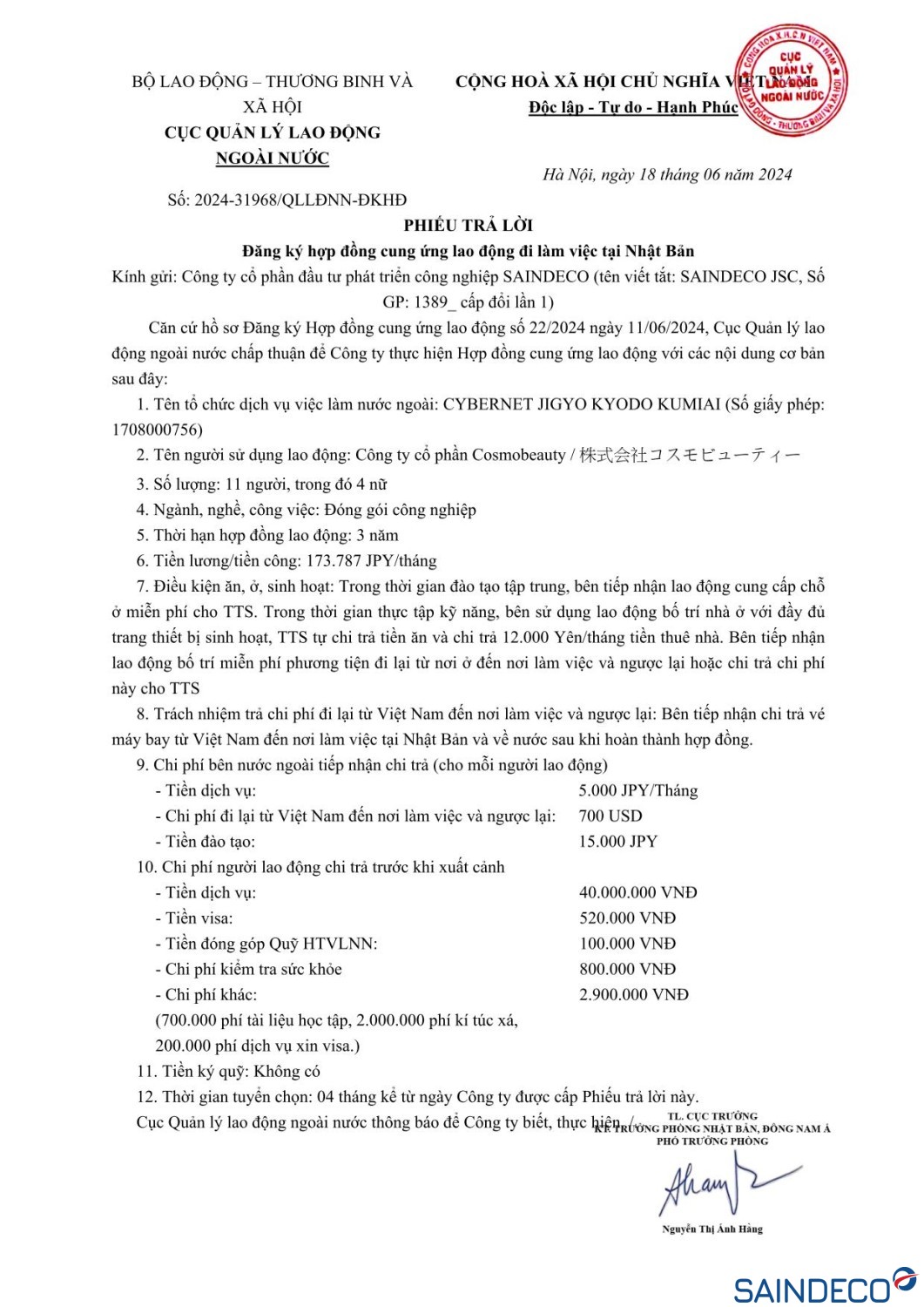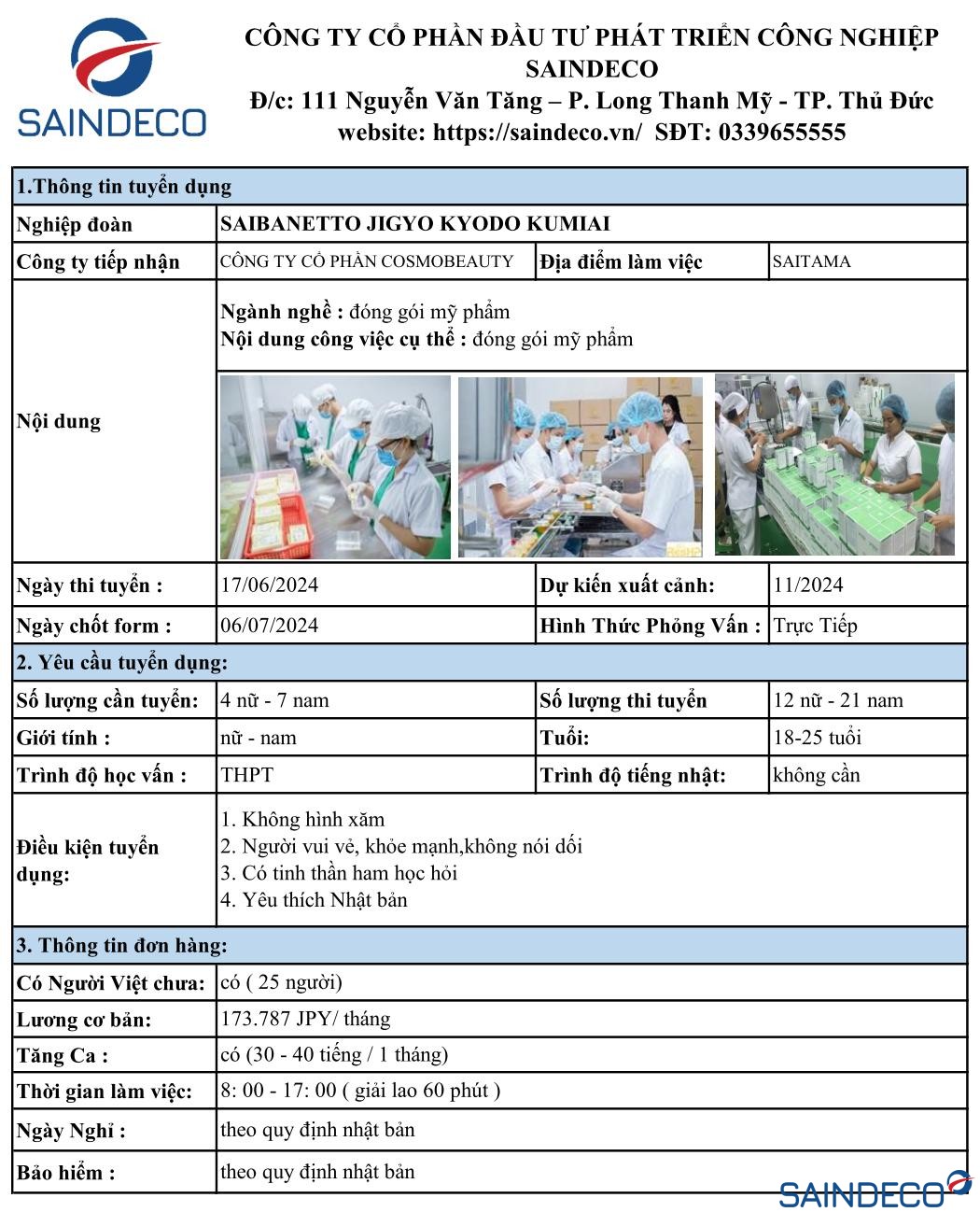 Ngày thi tuyển : 17/06/2024 Dự kiến xuất cảnh: 11/2024