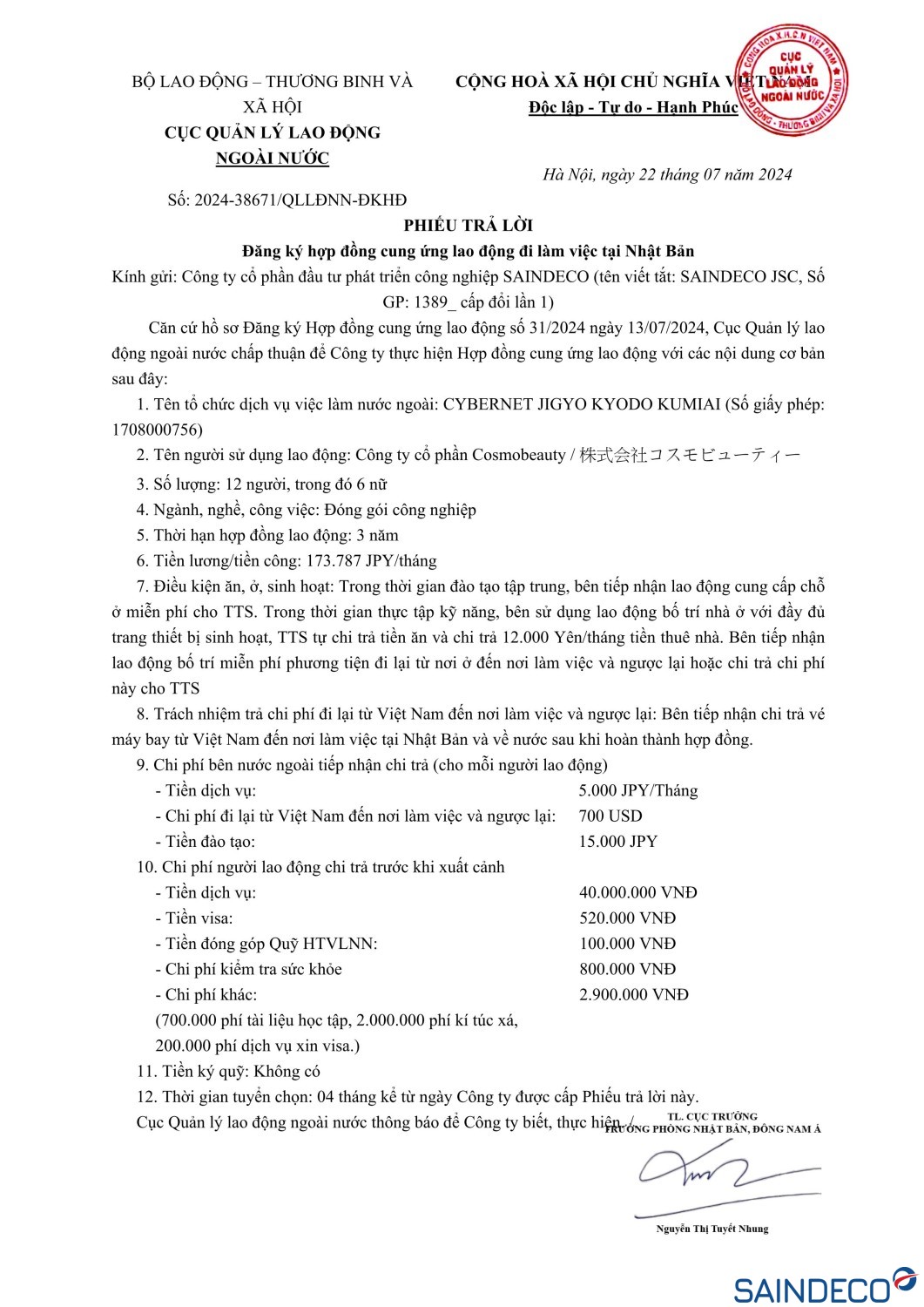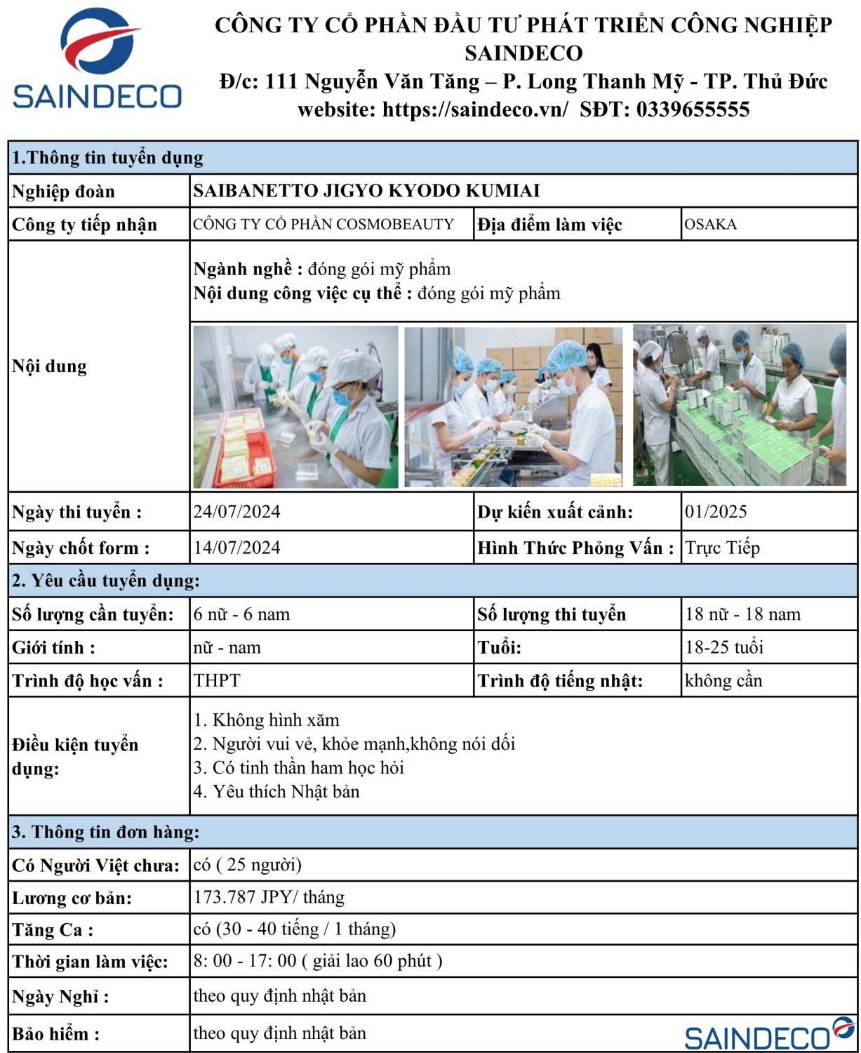 Ngày thi tuyển : 24/07/2024 Dự kiến xuất cảnh: 01/2025