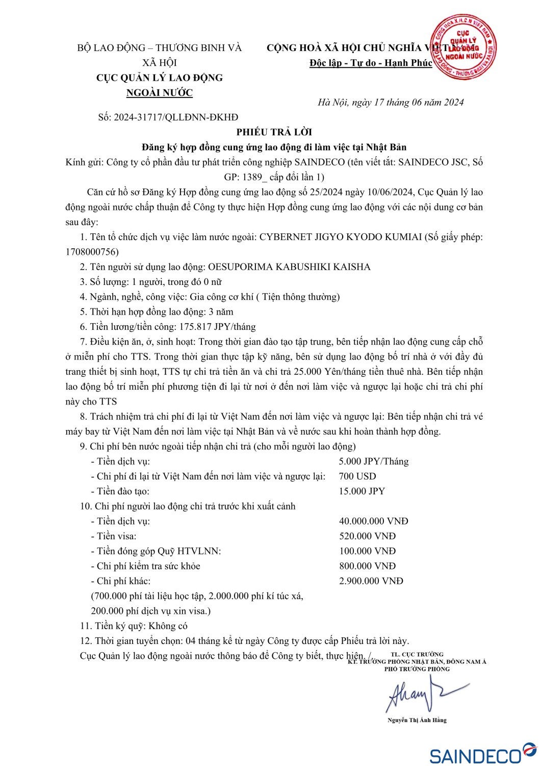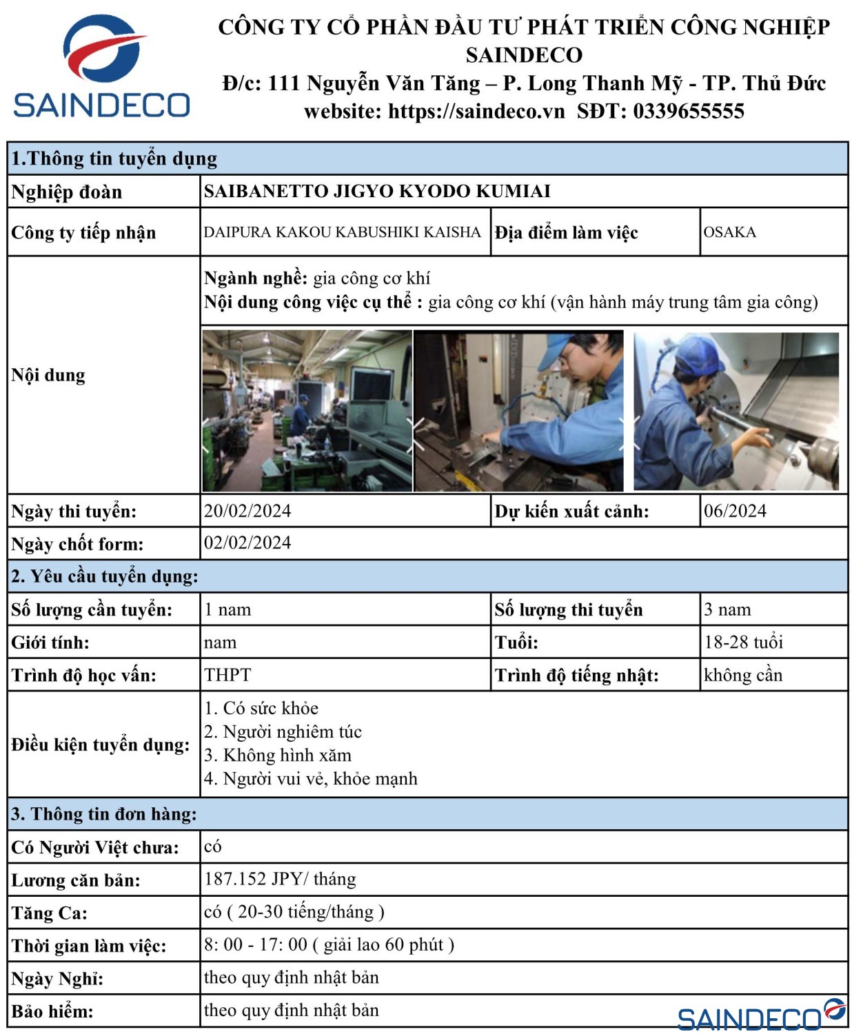 Ngày thi tuyển: 20/02/2024 Dự kiến xuất cảnh: 06/2024