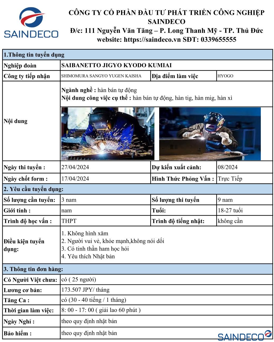 Ngày thi tuyển : 27/04/2024 Dự kiến xuất cảnh: 08/2024