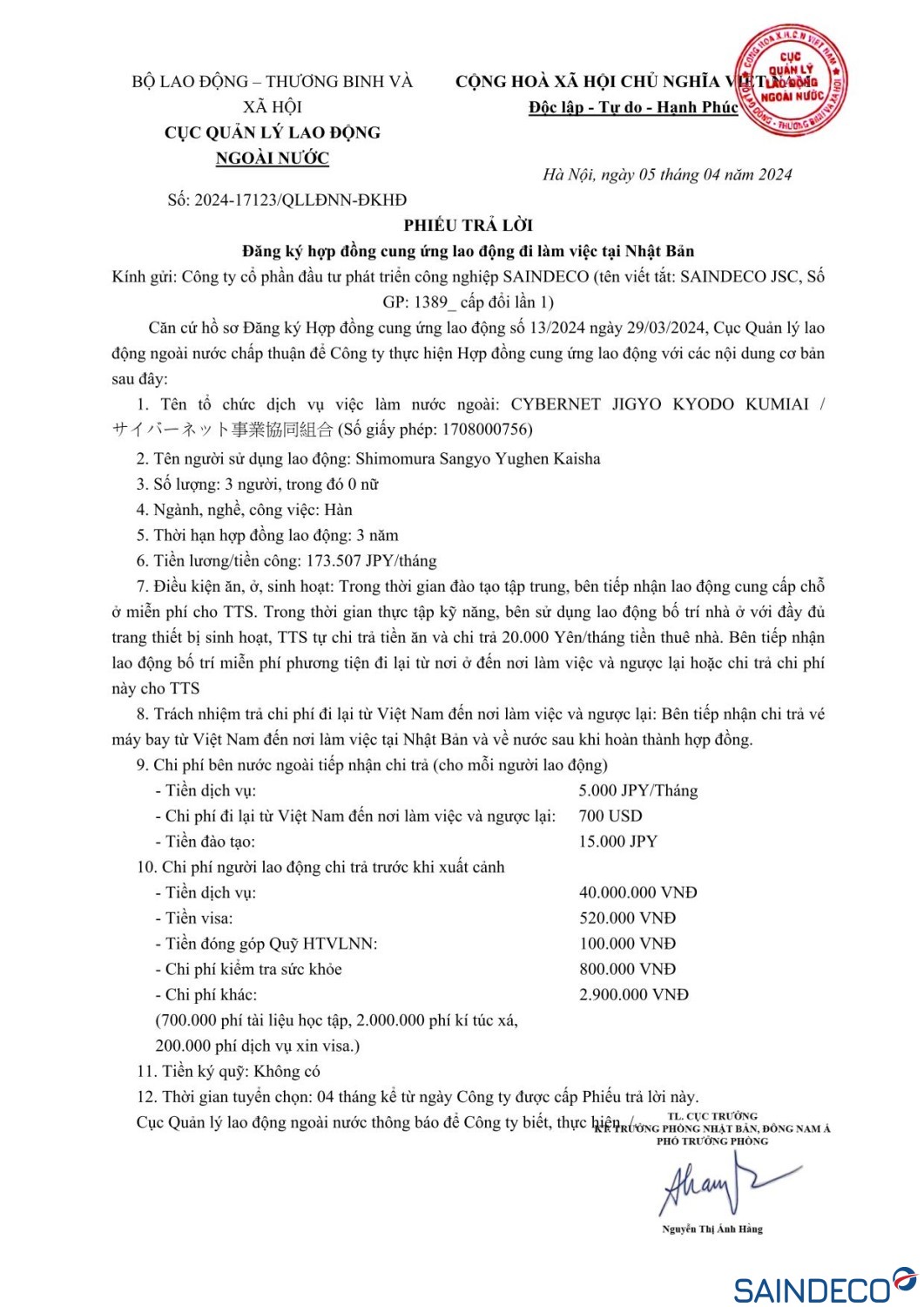 Ngày thi tuyển : 27/04/2024 Dự kiến xuất cảnh: 08/2024