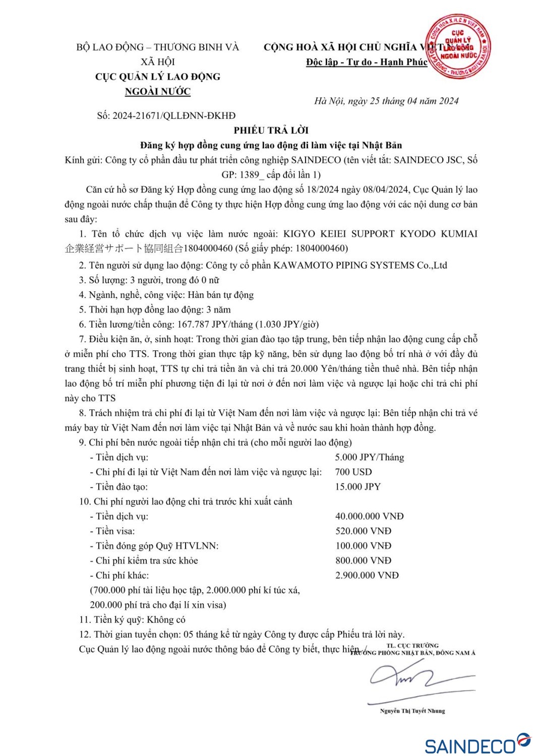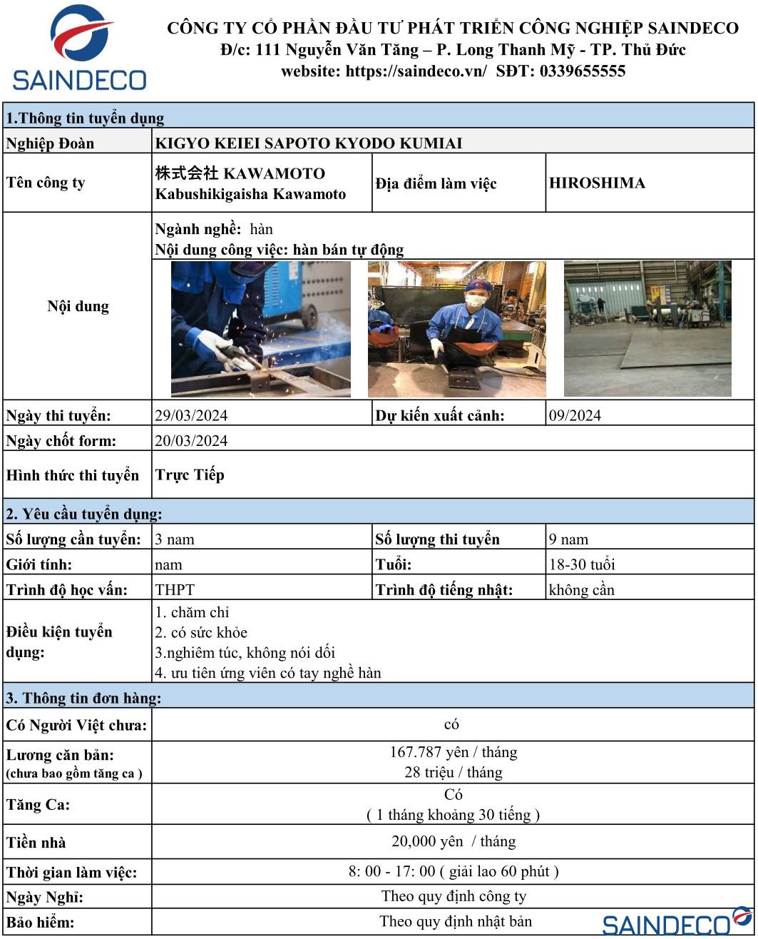 Ngày thi tuyển: 29/03/2024 Dự kiến xuất cảnh: 09/2024