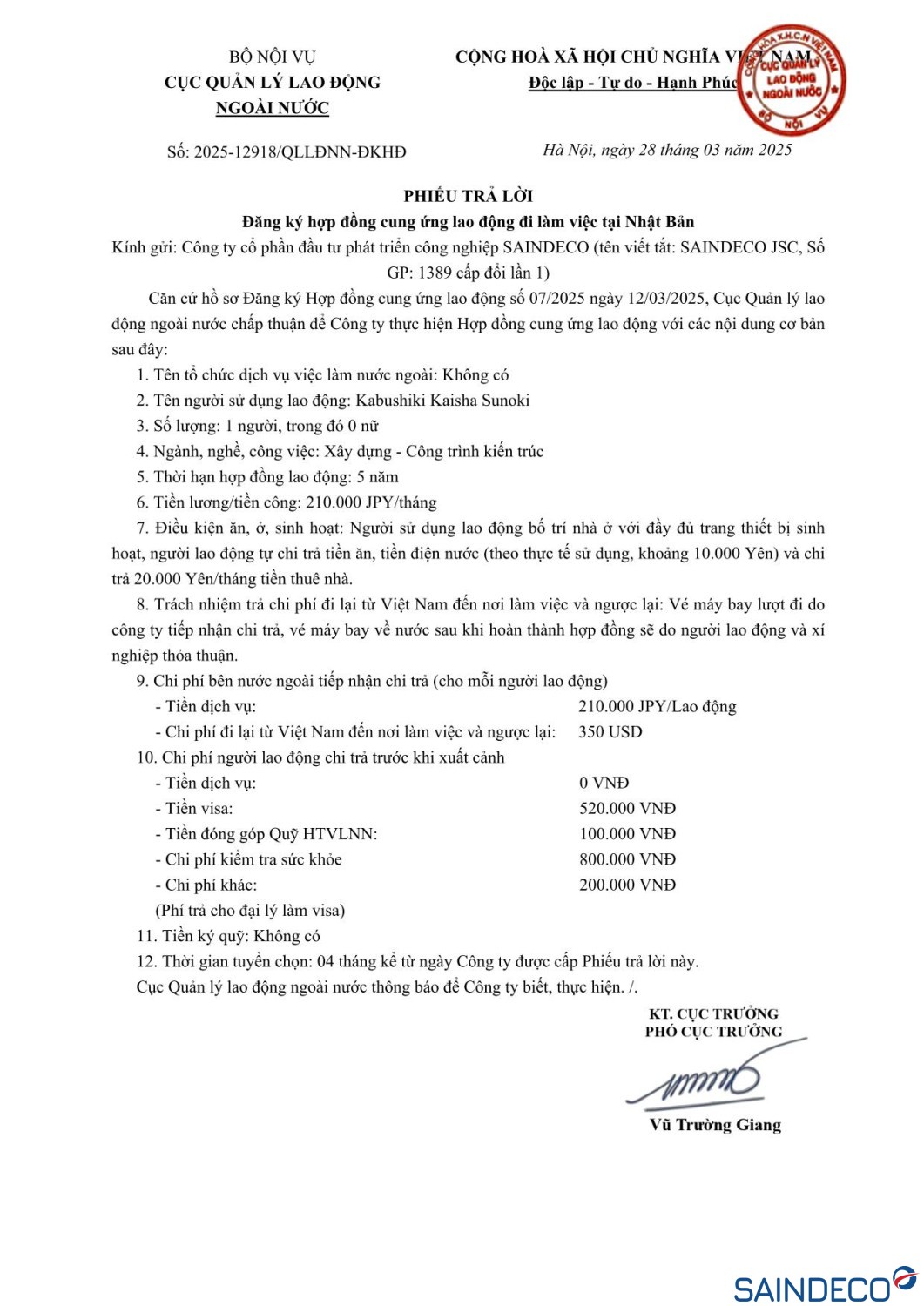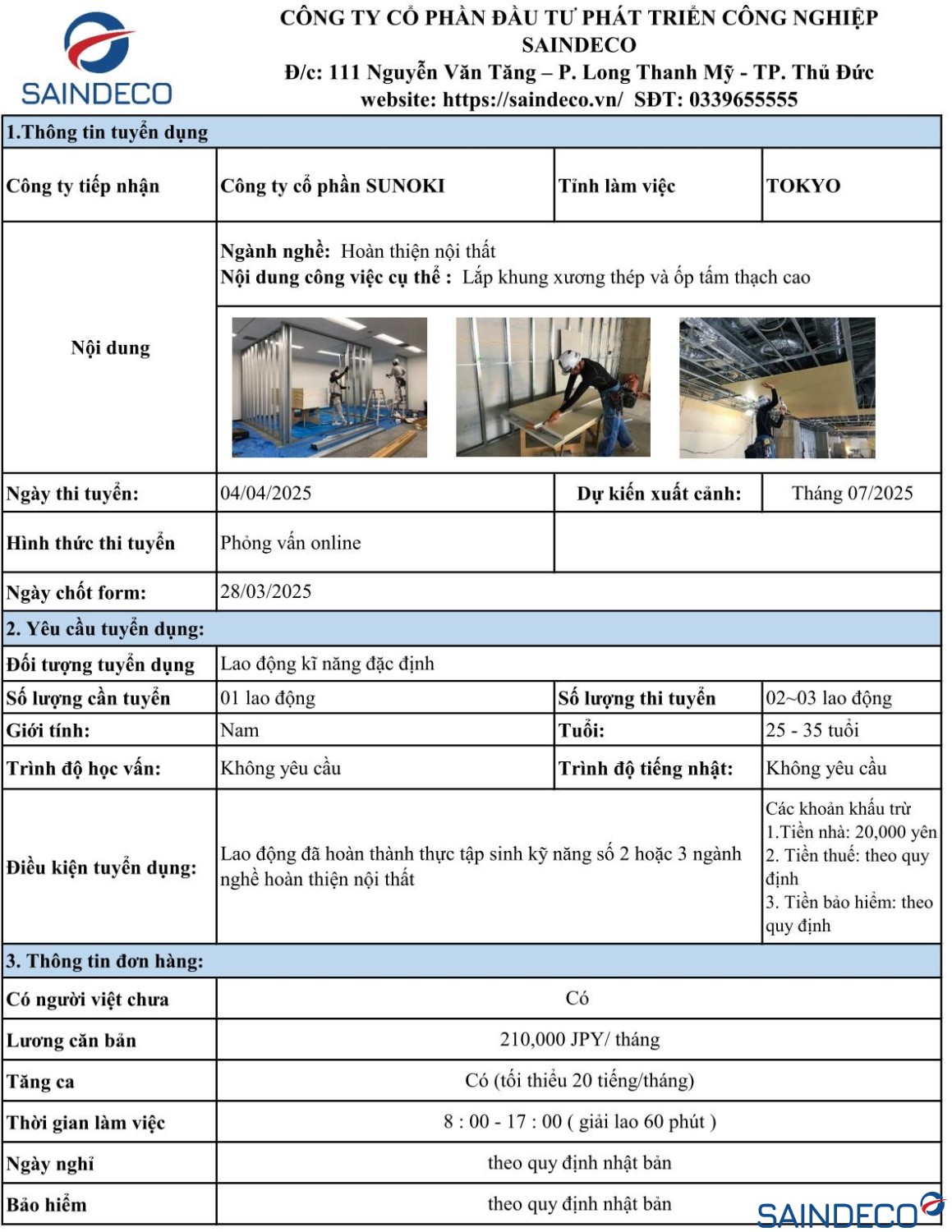 Ngày thi tuyển: 04/04/2025 Dự kiến xuất cảnh: Tháng 07/2025