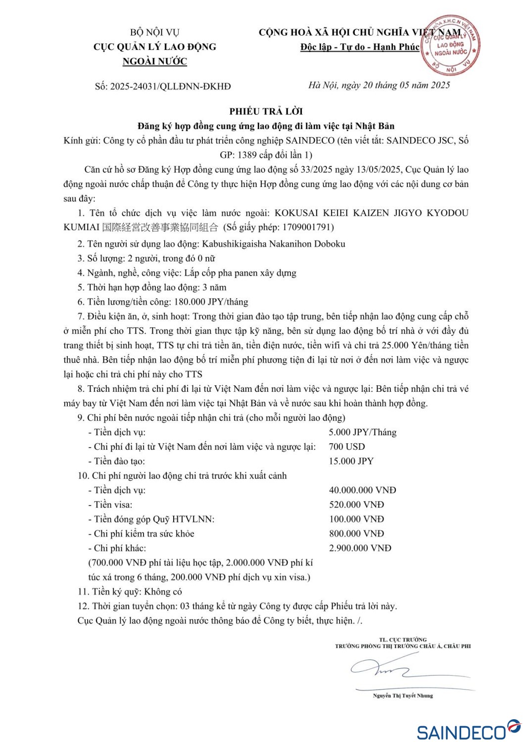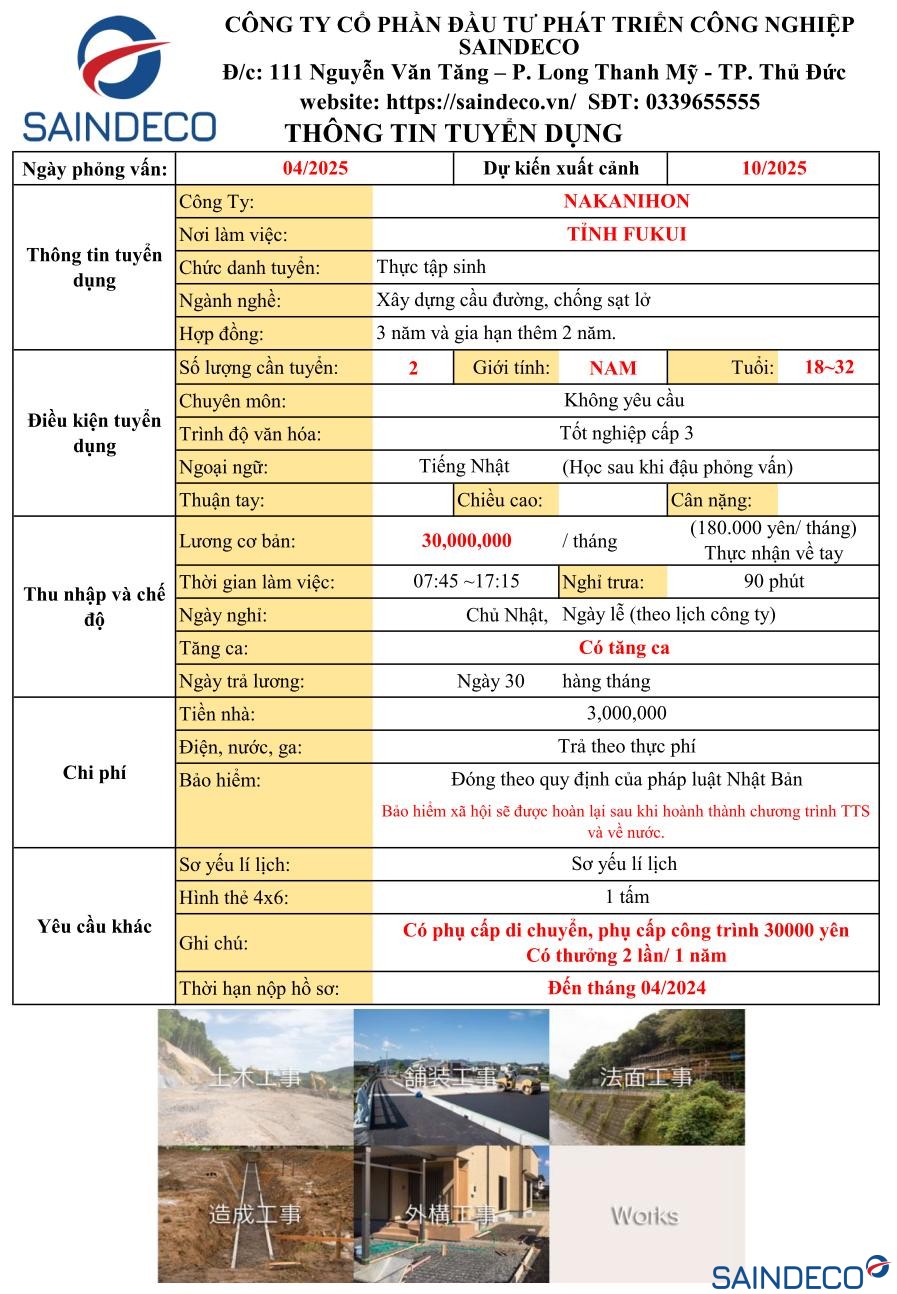 Ngày phỏng vấn: 04/2025 Dự kiến xuất cảnh 10/2025