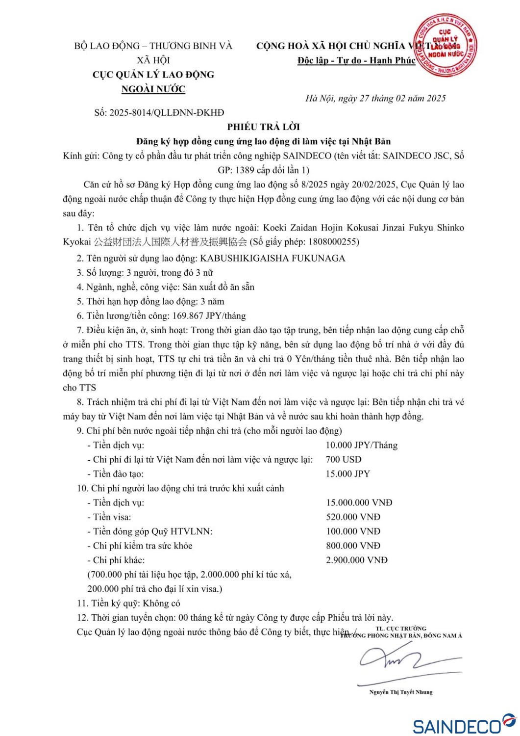 Ngày thi tuyển: 20/01/2025 Dự kiến xuất cảnh: 06/2025